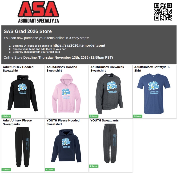 Please find a SAS Grad 2026 flyer and order form attached for your use. Samples are ordered and will be delivered to SAS by Monday, Oct 27th.